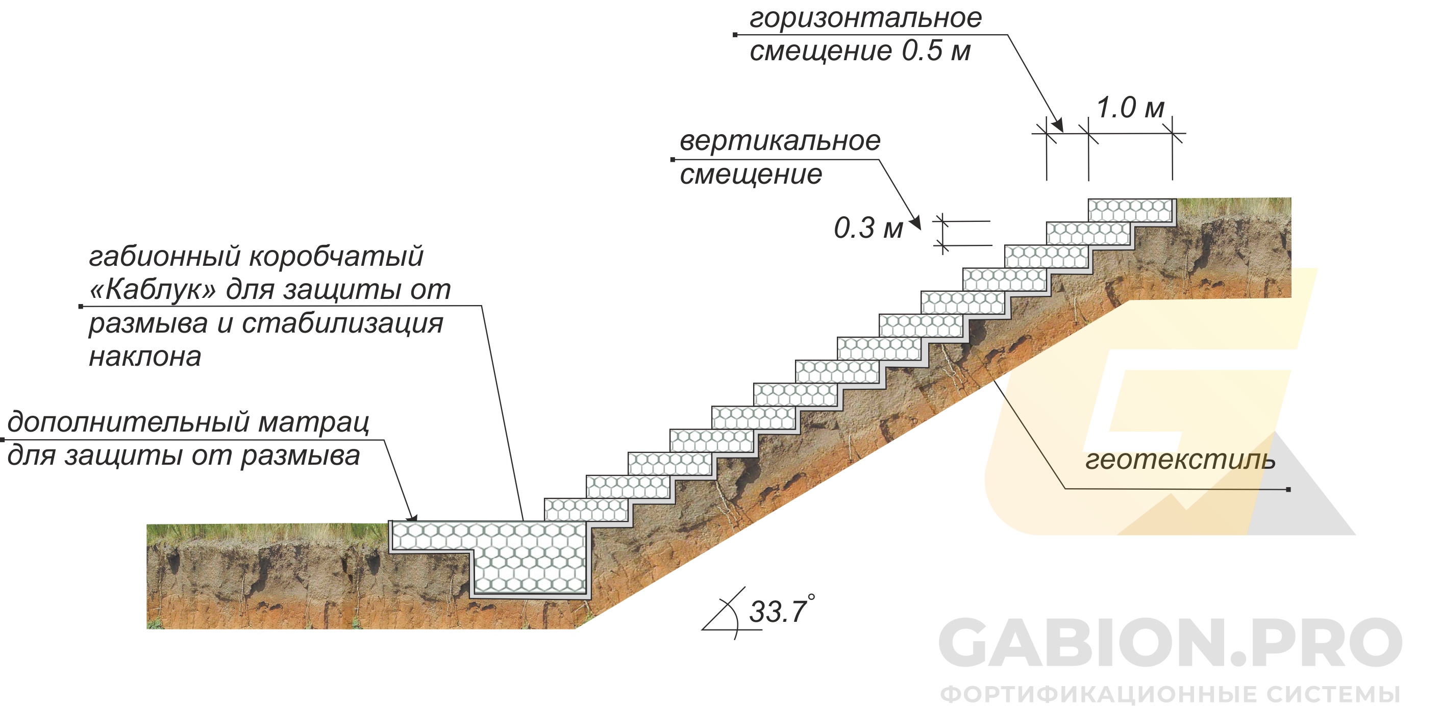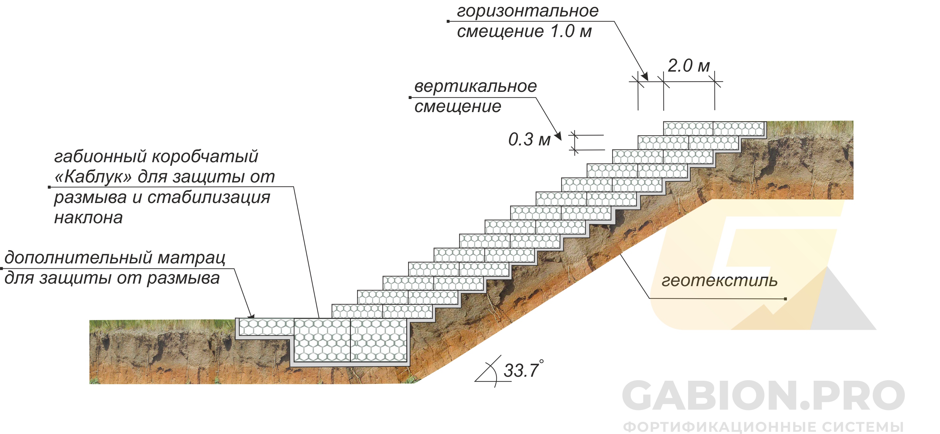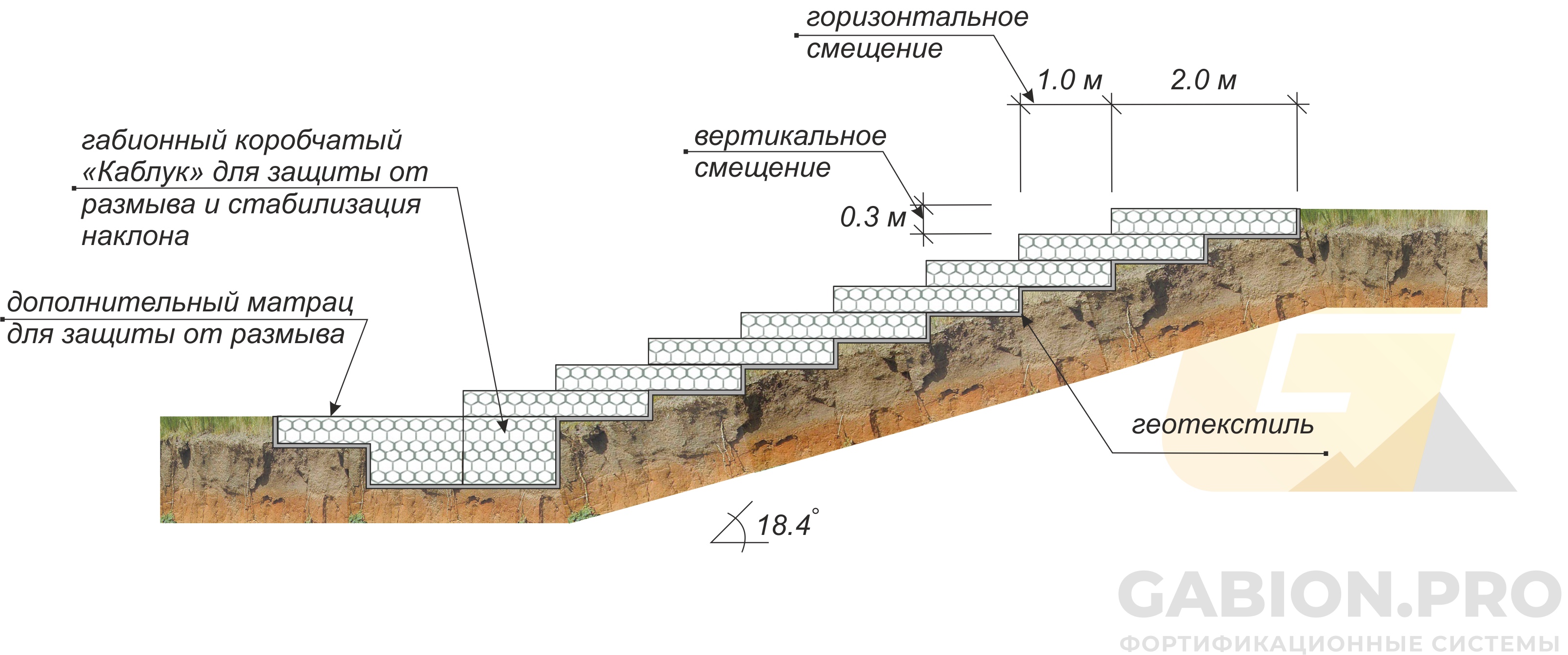 Ступенчатая монолитная конструкция монтируется из коробчатых типов габиона. Горизонтальное смещение не более 1/2 от ширины матраса первого ряда.